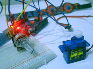 Kita akan membuat project untuk mengendalikan gerakan servo menggunakan potensio, atau lebih tepatnya kita akan menggunakan nilai analog yang dikeluarkan oleh potensio. Jadi jika potensio diputar ke derajat tertentu maka servo akan mengikuti berdasarkan nilainya.